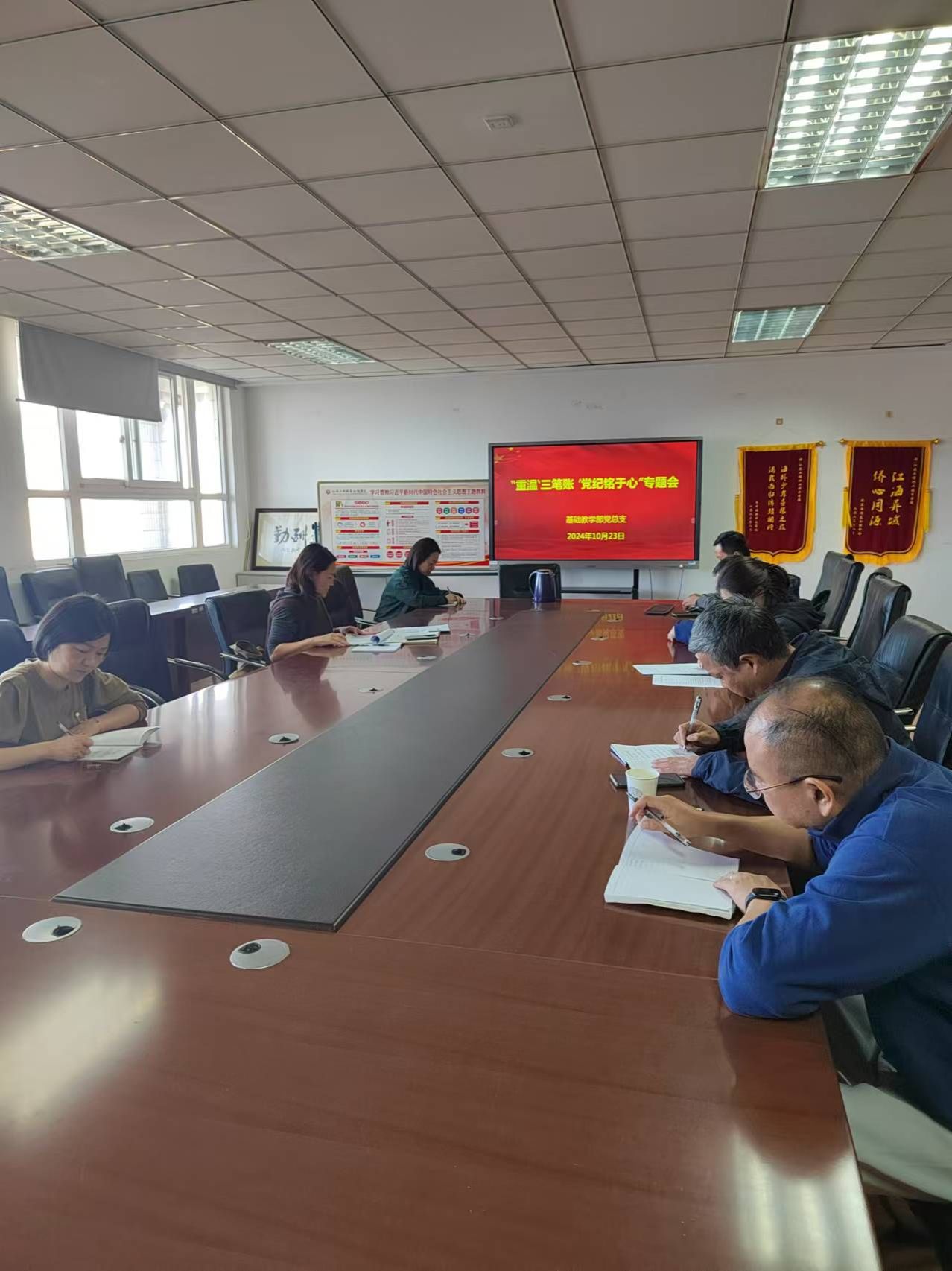 2024年10月23日,基础教学部党总支组织开展“重温‘三笔账’党纪铭于心”专题学习教育活动,党总支书记顾晓梅主持会议,总支委员和支部书记、副书记参与活动。