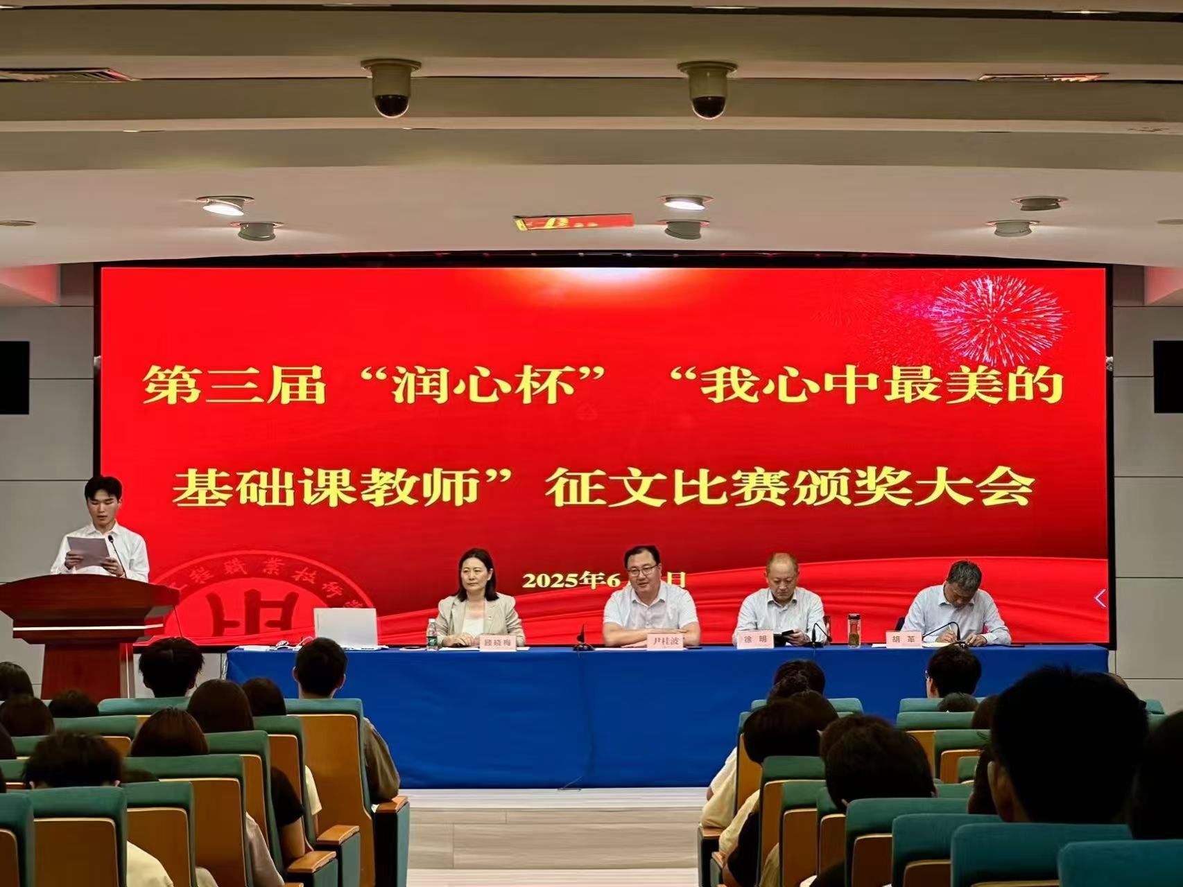 6月4日下午,第三届“润心杯”“我心中最美的基础课教师”征文比赛表彰大会在我校强毅楼十二楼报告厅召开。校党委委员、副校长尹桂波,学生工作处处长徐明,基础教学部主任胡革出席大会。基础教学部党总支书记顾晓梅主持会议。